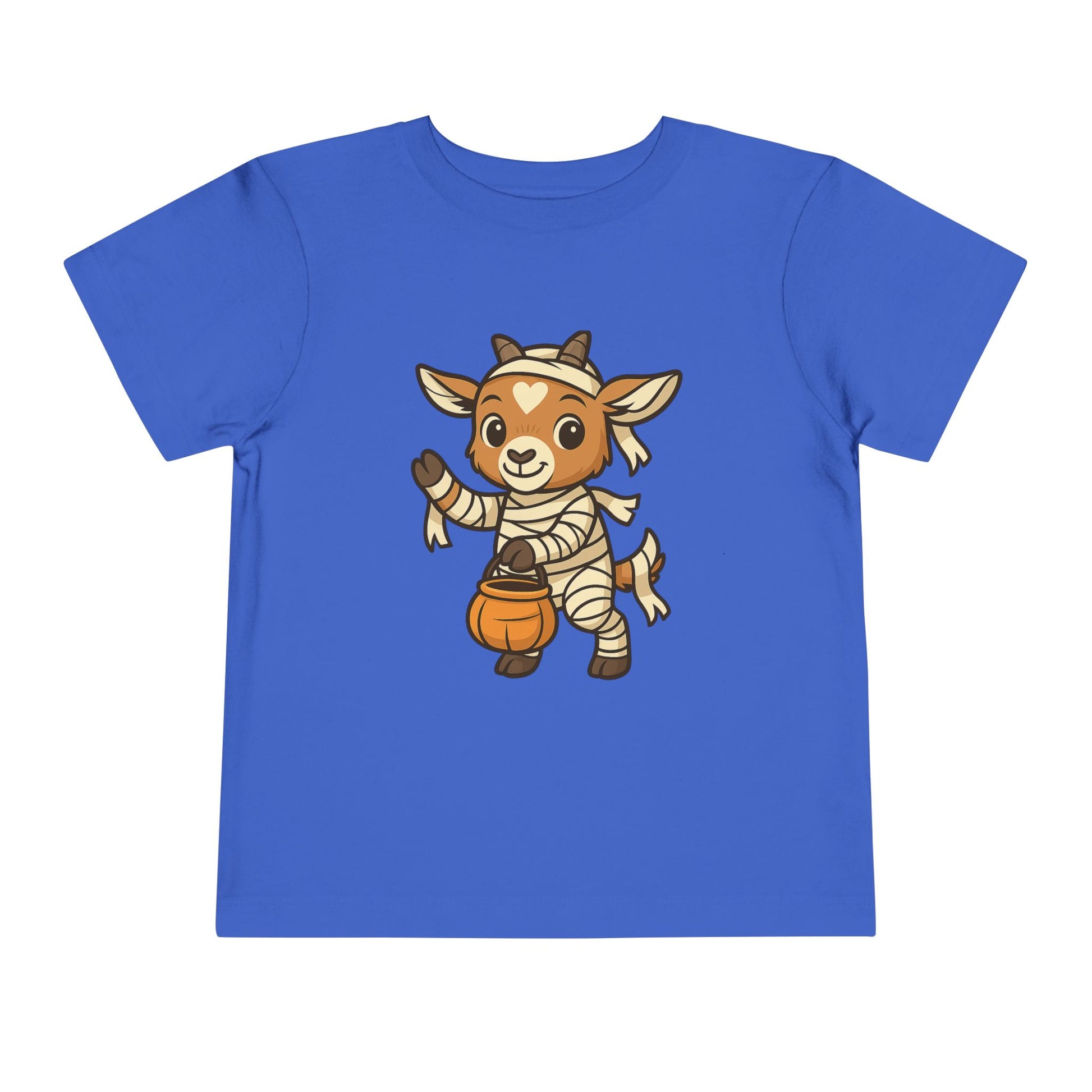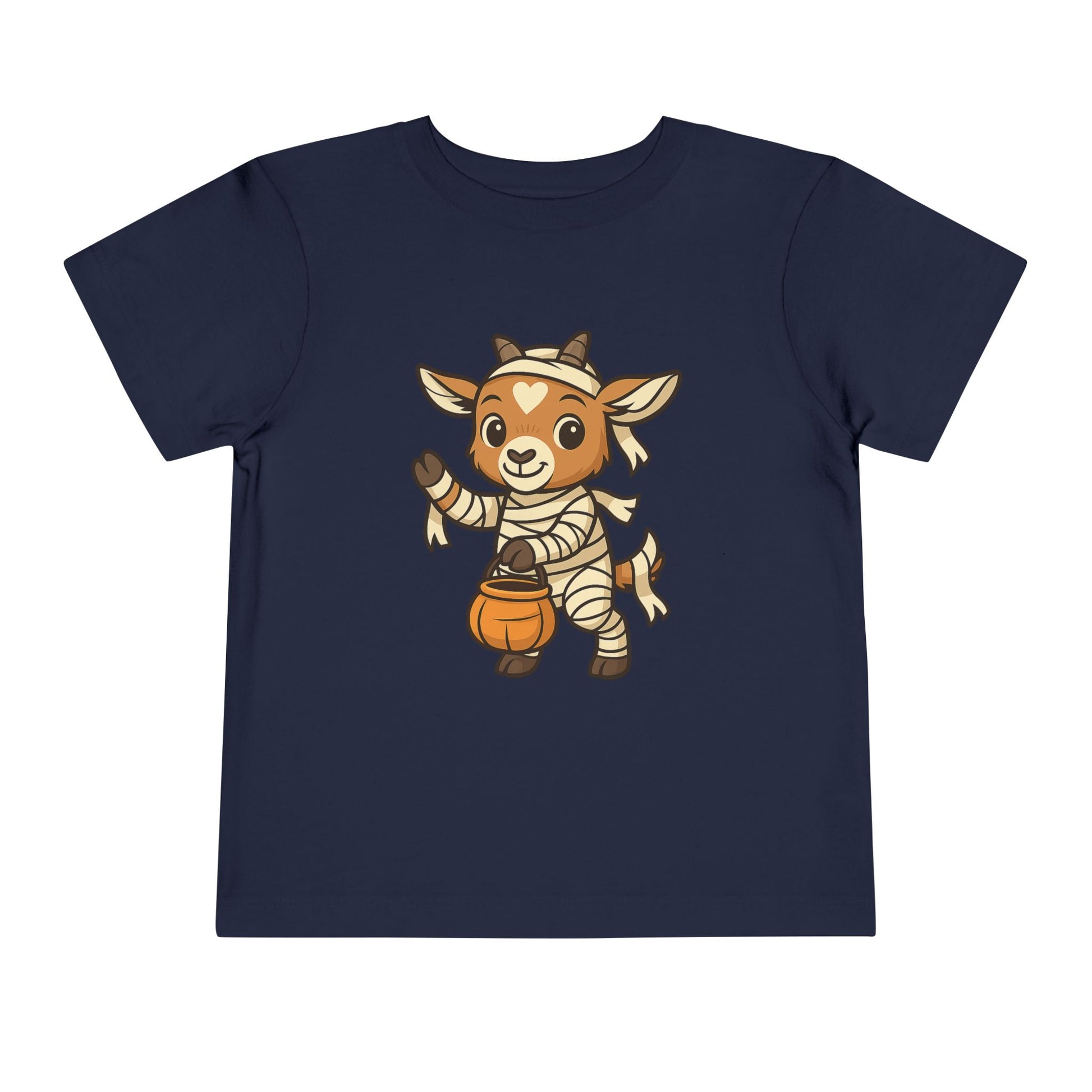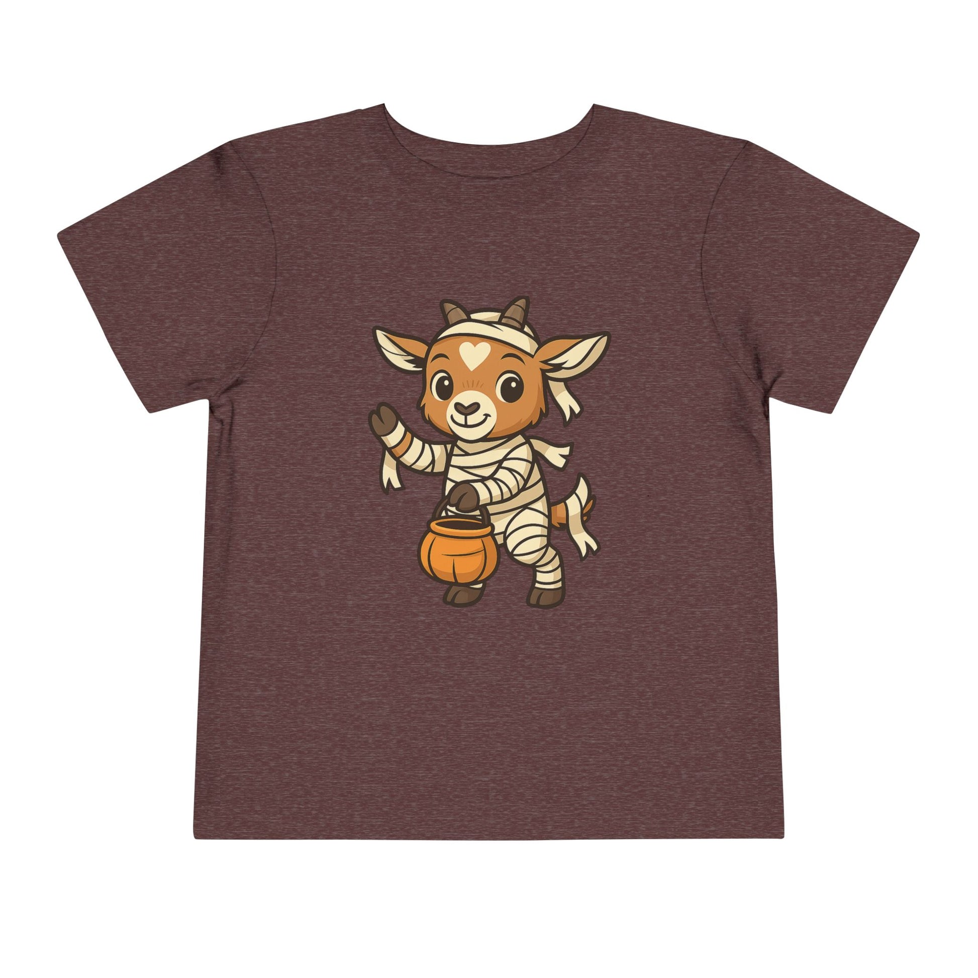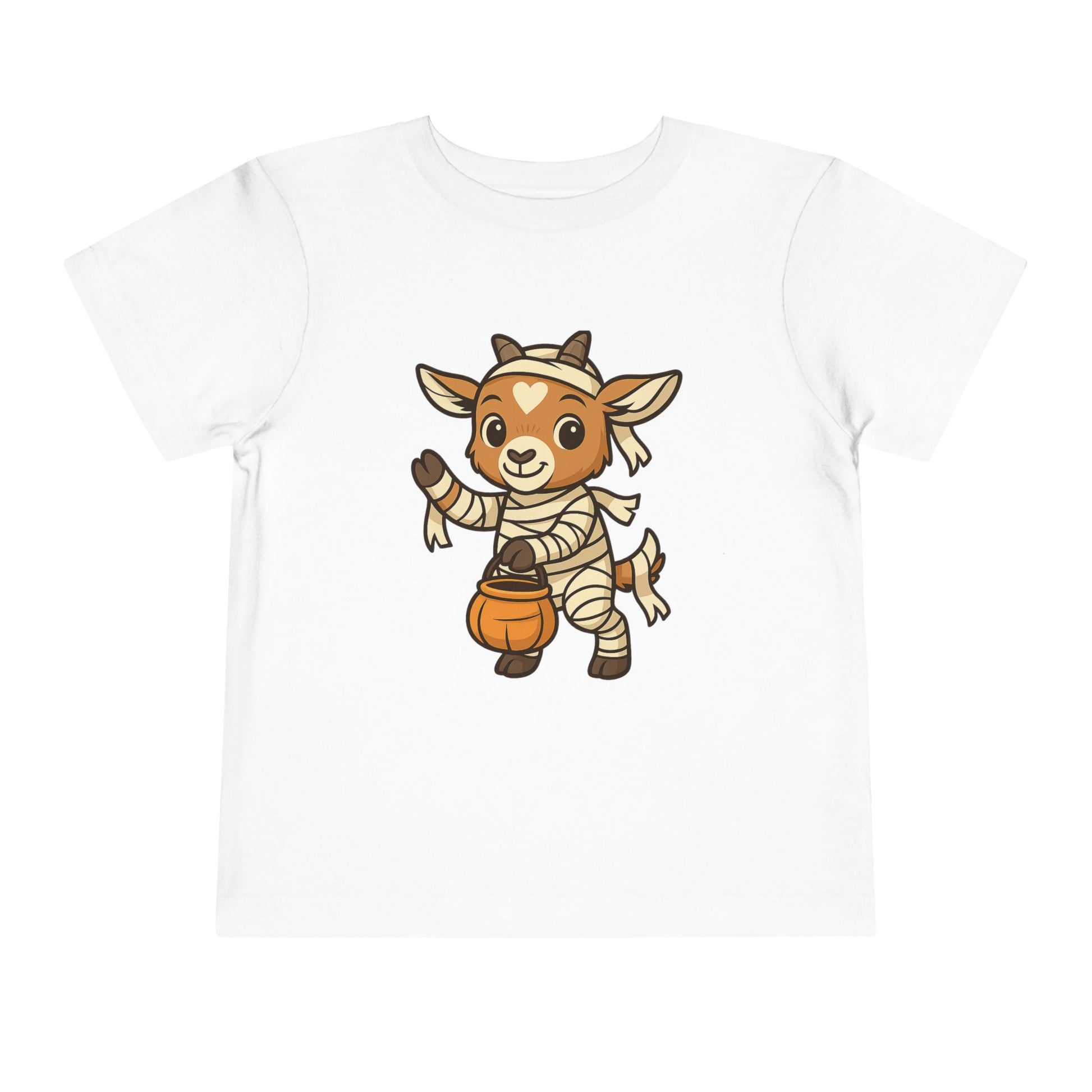 Wrap your little one in Halloween charm with this toddler t-shirt featuring our lovable goat kid dressed as a mummy! With beige bandages, a friendly expression, and a pumpkin treat bucket in hoof, this whimsical design is perfect for spooky season fun.