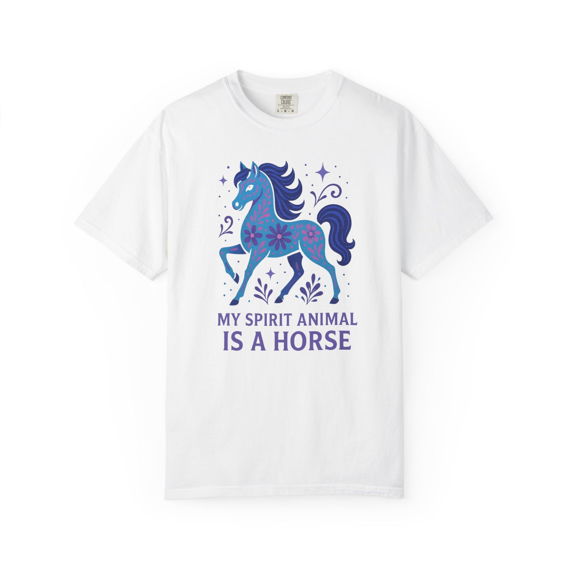 - Features a beautifully stylized horse with a vibrant floral pattern and the text "MY SPIRIT ANIMAL IS A HORSE."