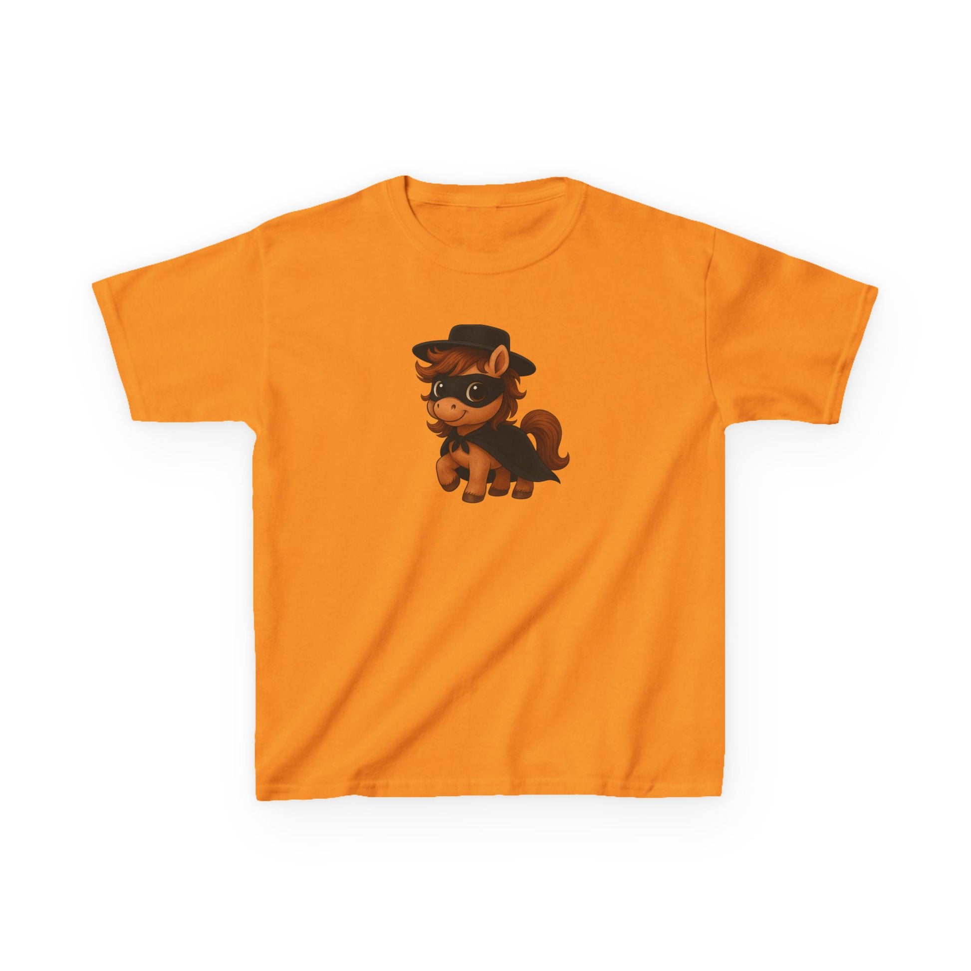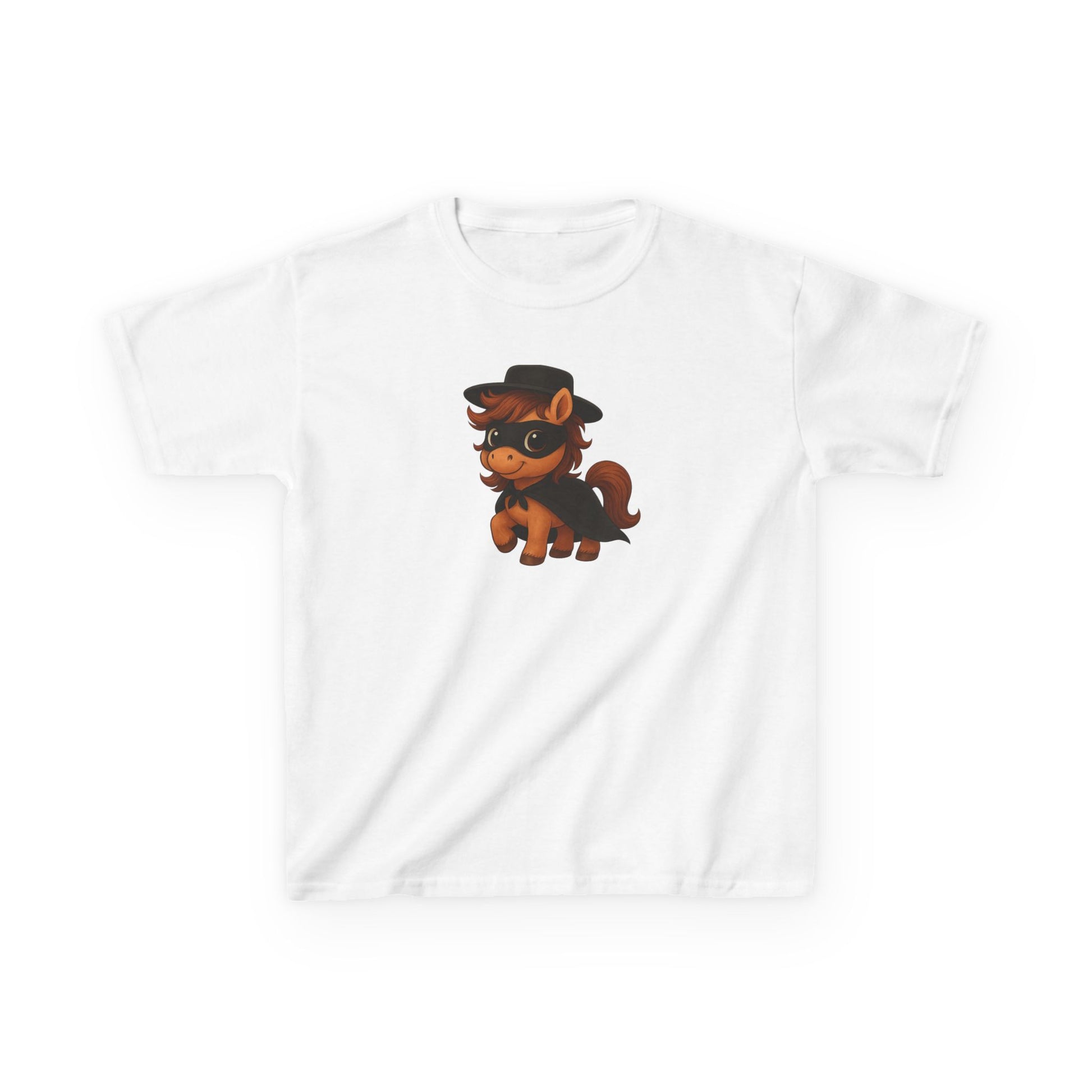 Youth Zorro Pony T-Shirt is perfect for pony lovers, ideal for birthdays, playdates, and everyday wear. Made with 100% US cotton, this tee offers a timeless style with a crew neckline and classic fit. Suitable for children and compliant with safety standards, it is a comfortable and ethical choice for any season.